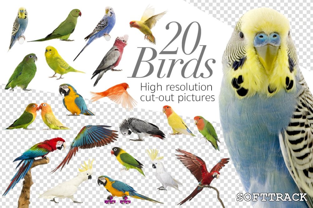 Deze set bestaat uit 20 hoge resolutie foto's van vogels, uitgesneden op een transparante achtergrond, beschikbaar in PNG-formaat.
