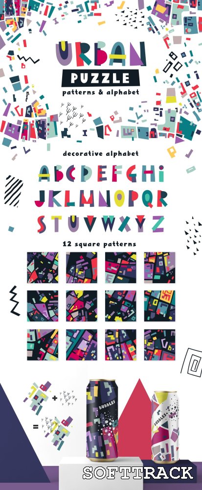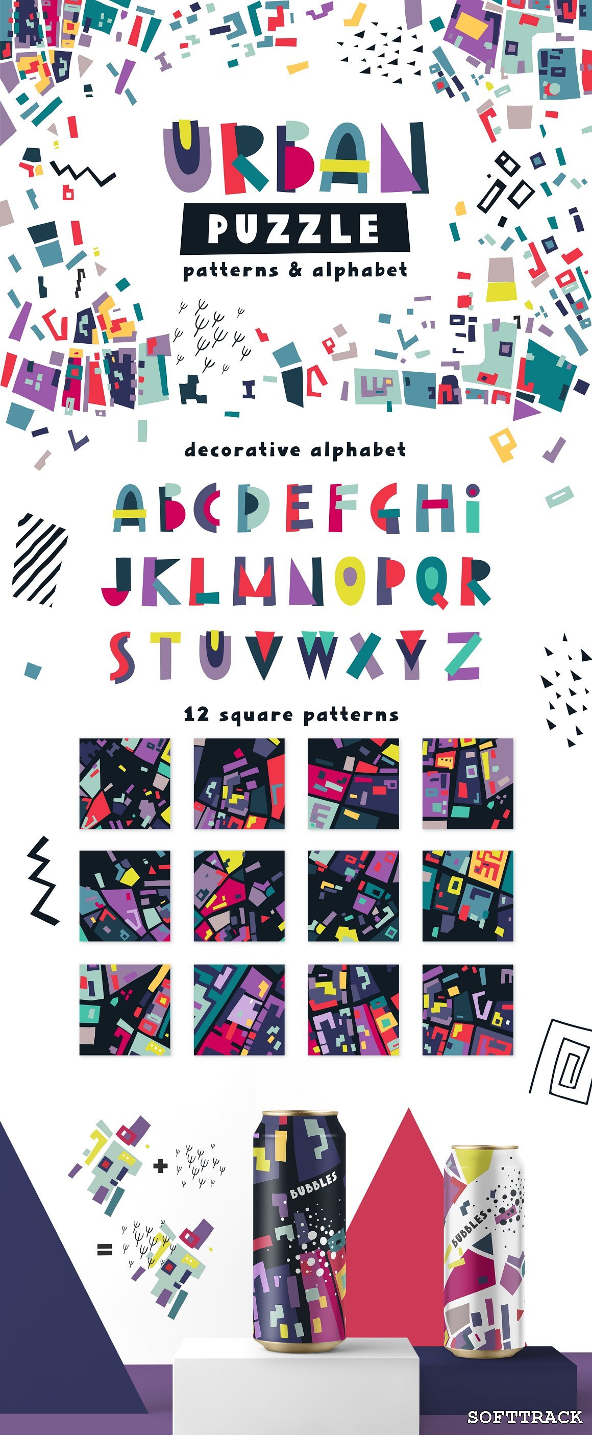 Urban Puzzle is een reeks patronen gebaseerd op de echte stadsplattegrond en het decoratieve alfabet. Het product is perfect voor city branding en design van evenementen. Ook geometrische vormen met lijnstructuren zijn geweldig voor verpakkingen, het bedrukken van kleding, collages en abstracte achtergronden. U kunt kant-en-klare vierkante of rechthoekige patronen gebruiken of u kunt uw eigen ontwerp maken van de elementen van de collectie.